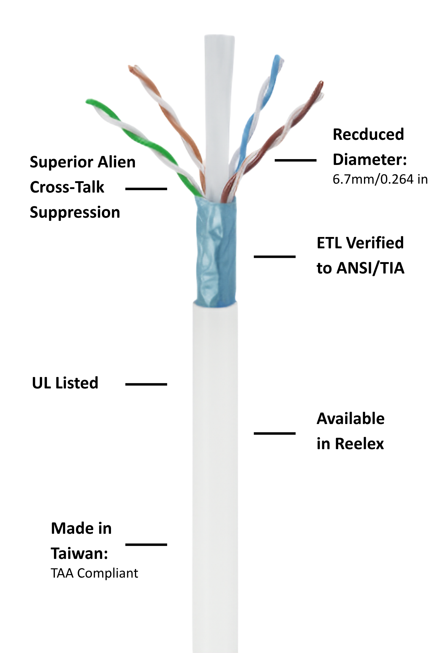 With this design, the cable itself has superior alien cross-talk suppression and a mere 6.7 mm OD!