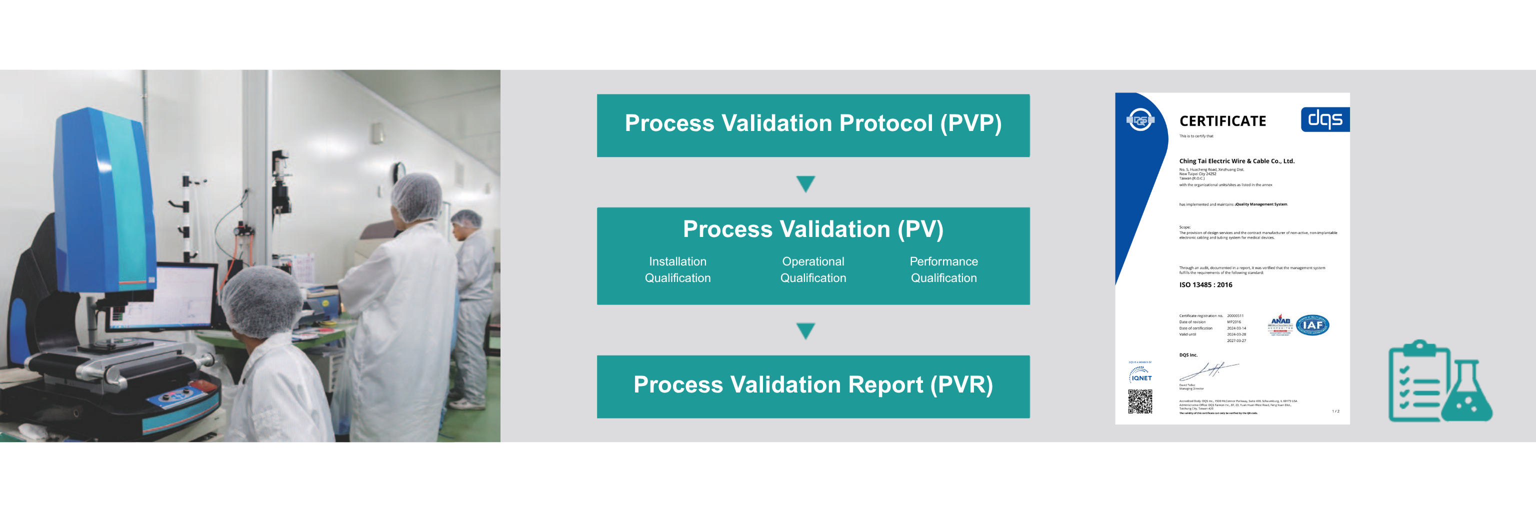 CTi holds ISO 9001, ISO 13485, ISO 14001, and ISO 14064 certifications as part of our quality system.Our NEBB-certified Class 100K cleanroom facility supports medical device cable and tubing manufacturing.Process Validation (PV) is conducted in accordance with a clearly defined Process Validation Protocol (PVP), encompassing equipment, personnel, and inspection methods. Upon completion, a comprehensive Process Validation Report (PVR) is compiled, detailing procurement records, measurement data, and process history — all reviewed and approved by the relevant departments.